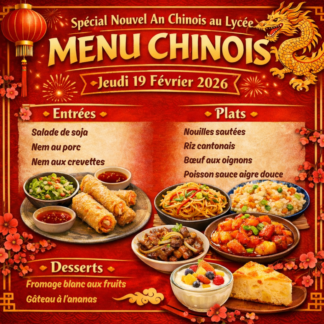 Dans le cadre de ses repas à thème hebdomadaires, le service de restauration du lycée proposera, le jeudi 19 février 2026, un menu spécial à l’occasion du Nouvel An chinois. Chaque semaine, ces rendez-vous culinaires permettent aux élèves et aux membres du personnel de découvrir de nouvelles saveurs et de […]