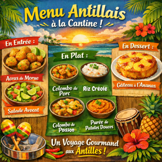 A l’occasion de notre repas à thème hebdomadaire, la restauration scolaire vous propose le jeudi 12 février un repas à thème antillais, invitant les élèves et personnels à un véritable voyage culinaire au cœur des Antilles. Ce menu met à l’honneur des saveurs ensoleillées et des recettes traditionnelles, élaborées par l’équipe de […]