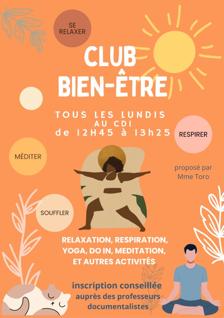 Le Club Bien-être, animé par Mme Toro, professeure documentaliste, accueille chaque semaine les lycéens et les étudiants désireux de s’accorder un moment de pause et de recentrage dans leur emploi du temps scolaire.